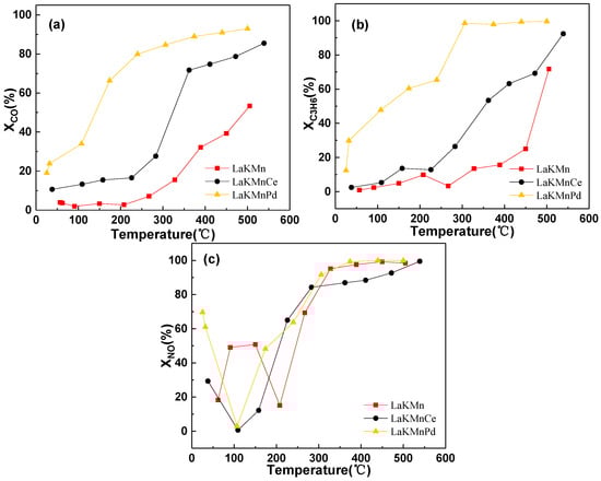 Figure 3 shows the conversion rates of C3H6, CO, and NO for the LaKMnO3, LaKMnCeO3, and LaKMnPdO3 catalysts. As shown Figure 4a, the conversion rate of C3H6 is enhanced with the increase in temperature. After Pd doping, the LaKMnPdO3 catalyst exhibits the best performance in removing C3H6, reaching a conversion rate above 90% at 288 °C. In contrast, after Ce doping, the LaKMnCeO3 catalyst reaches a conversion rate above 90% only at a temperature of 530 °C. As shown in Figure 4b, the CO conversion rates of the three catalysts are also gradually improved with the increase in temperature. The Pd-doped catalyst shows the best performance in CO removal, reaching a conversion rate of 50% at 141 °C. In contrast, the Ce-doped catalyst reaches a CO conversion rate of 50% at 324 °C, while the undoped LaKMnO3 catalyst exhibits the lowest CO conversion rate of 50% at 492 °C.