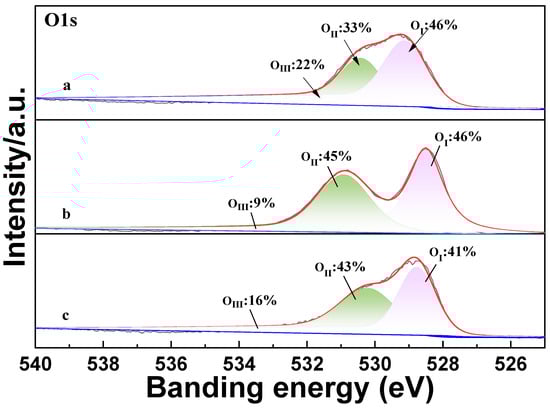 There are three forms of oxygen in the XPS peak spectrum of O1s, which are lattice oxygen OI in the range of 528.5–530.2 eV and the intermediate binding energy peak OII at 531–532 eV, assigned to the adsorbed oxygen, and high-binding oxygen OIII around 533 eV corresponding to the hydroxyl group on the surface [16,17]. Figure 4 reveals that after K and Ce co-doping, the ratio of the peak area of the high-binding OII and low-binding energy peak OI of the catalyst increased significantly. To clarify the content changes in the different forms of oxygen in the catalyst, we performed a semiquantitative analysis of the O1s spectrum. The result shows that Ce and Pd doping increases the content of adsorbed oxygen, which enhances the oxidation activity of the catalyst. Additionally, the quantitative results illustrate that Pd doping increases the OIII content, which contributes to improving the catalyst’s selectivity and NOx conversion rate.
