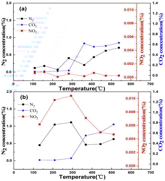 Figure 5 shows the reaction process of the LaKMnCeO3 and LaKMnPdO3 catalysts under oxygen-rich conditions. It is obvious that the concentrations of CO2 in the catalysts doped with Ce and Pd are gradually improved with the increasing temperature. With the low temperature range (100–400 °C), the concentrations of N2 and NO2 for catalyst b (LaKMnPdO3) are remarkably higher than that of catalyst a (LaKMnCeO3). This suggests that more oxygen vacancies can be generated by Pd doping, which enhances the mobility of oxygen and effectively improves the NOx storage capacity of a catalyst at a low temperature. After 400 °C is reached for the LaKMnCeO3 and LaKMnPdO3 catalysts, the concentrations of CO2 are gradually increased, whereas the concentrations of NO2 are decreased. This is because the stored NOx experiences desorption and decomposition and then reacts with reducing gasses such as CO and HC, leading to an increase in the concentration of CO2. It should be noted that this is consistent with the results of the conversion rate curves in Figure 3.