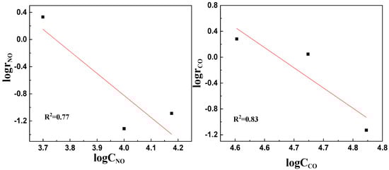 For the temperature gradient experiment, the concentrations of NO and CO were set as constants with a total gas flow rate of 500 mL/min, and the catalyst mass was 0.45 mg. Accordingly, the conversion rate (α) and NO reaction rate (rNO) are shown in Table S3. Linear fitting was performed with RT/1 as the x-axis and lgrNO as the y-axis. The fitting equation was obtained as y = 14,916x + 1.3694 with a correlation coefficient of R2 = 0.7084. According to the Arrhenius equation, both sides of Equation (10) were taken by logarithm, and Equation (1) can be obtained. Therefore, the slope of the fitting equation corresponds to the activation energy of the reaction, Ea = 14,916 kJ/mol, while the intercept of the equation is lnA + lnf(x), so the pre-exponential factor A can be achieved.