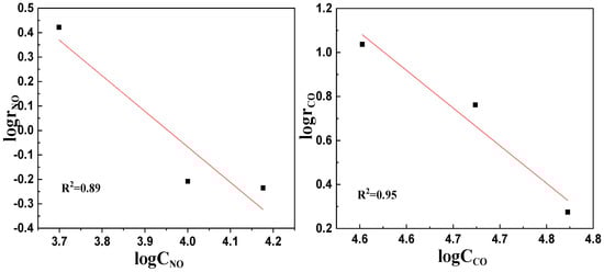 The logarithms of the CO concentration and CO reaction rate were taken as lgrCO and lgCCO, and linear fitting was performed with lgCCO as the x-axis and lgrNO as the y-axis, as shown in Figure 7 (right). The linear regression equation about the catalytic reaction rate of LaKMnPdO3 can be determined as y = −4.2761x + 20.76 with a correlation coefficient of R2 = 0.9537. The slope of the equation corresponds to the reaction order of the CO concentration in the catalytic reaction of LaKMnPdO3 in which b = −4.2761.