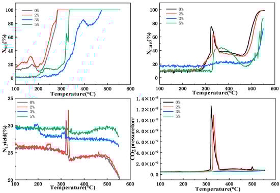 In this paper, the catalytic activity for the investigated catalysts was evaluated by CO conversion (XCO), NO conversion (XNO), and soot initiation temperature (Ti). In the reaction process, the conversion rate of the reaction gas was calculated using the following formula, and the soot initiation temperature is the temperature at which the tangent is intersected with the zero concentration at the slope of the maximum peak of the CO2 concentration rate change. Ti is calculated from a differential drawing of the CO2 concentration curve by making a tangent line at the slope of the maximum peak of the concentration rate change to the temperature where it intersects with zero concentration.