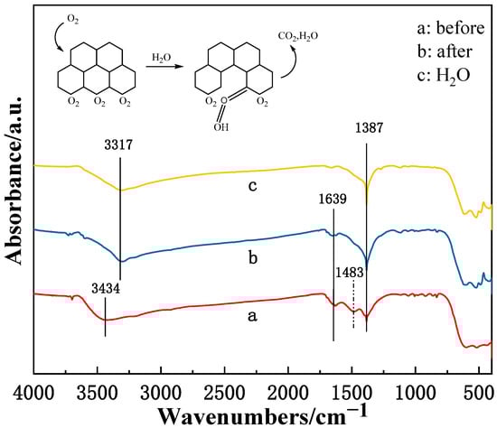Figure 9 shows the FTIR results of the LaKMnPdO3 catalyst before and after the anhydrous activity test and after the water activity test. The stretching vibration peak of -OH appears at 3446 cm−1, and the stretching vibration peak of hydrogen-bonded OH appears at 3317 cm−1. Compared with catalyst a, the shape of the hydroxyl stretching vibration peak in the catalyst system of catalyst b remains essentially unchanged, but the peak intensity increases, and the peak position shifts to a lower wavenumber (red shift), which indicates that the hydrogen bonding mode of hydroxyl groups in the system has changed. The peak at 1639 cm−1 is attributed to the O-H bending vibration of the adsorbed water surface hydroxyl groups. The peak at 1387 cm−1 is characteristic of free nitrate ions. The peak at 1483 cm−1 is attributed to the characteristic absorption of K2CO3 while no distinct K2CO3 phase was detected in the XRD, indicating that K2CO3 is dispersed on the surface of the catalyst support. In Figure 8, it can be seen that after the temperature-programmed experiment, the characteristic peak of nitrates (1381 cm−1) gradually replaced the characteristic peak of carbonates (1483 cm−1). This indicates that carbonates contribute to the storage of NOx. Meanwhile, the O-H bending vibration peak of the catalyst disappears after water exposure, and the nitrate characteristic peak becomes sharper, which illustrates that water addition changes the O2 activation mechanism and promotes nitrate formation. Based on the above analysis results, we deduce the mechanism of water effects on the catalytic soot combustion process, as illustrated in Figure 8. First, gas-phase oxygen adsorbs onto the free carbon sites on the soot surface. Then, with the addition of water, hydrogen bond interactions between water molecules and oxygen lead to the formation of O2…H2O complexes. Second, the hydrogen atoms from the water transfer to the adsorbed O2 and form OOH groups in the presence of soot. And as the temperature rises, these OOH groups react with soot over the catalyst, producing CO2 and H2O.