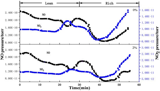The obtained samples were tested in the role of the two catalysts (LaKMnCeO3 and LaKMnPdO3) of NOx storage and reduction. Figure 5 shows the results of the De-NOx process, which further confirms the reaction process in Figure 3.