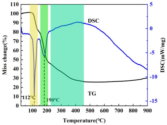 It is well known that the precursor has a significant influence on the resultant h-BN. In order to optimize the precursor treatment conditions, the effect of temperature on precursors is discussed. The treatment temperature of precursors is firstly determined by the thermogravimetric analysis of the mixture of H3BO3 and CO(NH2)2 at a heating rate of 5 °C min−1 under air atmosphere from room temperature to 900 °C. As shown in Figure 1, the whole reaction process mainly includes three weightlessness stages. The first one is at 100–140 °C, and the endothermic peak is mainly assigned to the melting and decomposition of urea. During the process, when the temperature exceeds the urea melting point (132.7 °C), urea immediately produces a large amount of ammonia gas, isocyanic acid and biuret [19], etc., which leads to the rapid decrease of the mass. Meanwhile, the dehydration of H3BO3 to metaboric acid (HBO2) also contributes to the mass decrease. The second one is at 155–200 °C and the endothermic peak corresponding to the decomposition of biuret and residual urea. The third one is at 220–400 °C, and there exist weak exothermic reactions during the stage, which is caused by the further decomposition of HBO2 [20,21]. Based on the above results, it can be found that no reaction happens when the temperature is below 100 °C. The transition stage of the first and second stages is 140–155 °C, and the second stage is completely over when the temperature is above 200 °C; in addition, because NH3 is in favor of the growth of h-BN along the (002) plane during the synthesis process, and most of NH3 has escaped at 145 °C. Also, H3BO3 and CO(NH2)2 have decomposed to form a complex intermediate at 250 °C. Therefore, 85 °C, 145 °C and 250 °C were chosen to study the effects of precursor treatment temperatures (PT) on h-BN products.