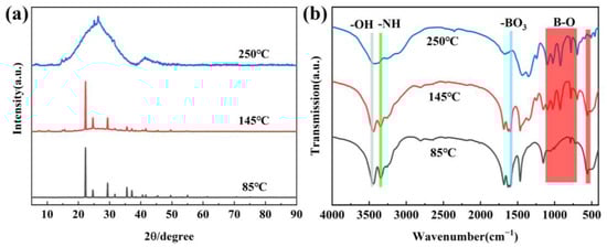 Figure 2a shows the XRD of precursors obtained at different temperatures. When the treatment temperature is 85 °C, the diffraction peaks correspond to H3BO3 (JCPDS 73-2158) and CO(NH2)2 (JCPDS 83-136). This is because the temperature is too low for the reaction to occur. With the temperature increasing, the new diffraction peaks of metaborate, biuret and isocyanic acid appear, indicating that the decomposition of H3BO3 and CO(NH2)2 has happened, accompanied by a release of CO2, H2O and NH3 gases. When the temperature continuously increases to 250 °C, the peaks of H3BO3, CO(NH2)2 and their by-product cannot be found, and two board peaks at 20–30 and 40–45° appear, which reflects that the precursor is amorphous and the new substance has formed. The new substances are composed of the by-product H3BO3 and CO(NH2)2, and they can be identified to the boron oxynitride-related one [10]. The result is in accordance with thermogravimetric analysis and further confirms that the temperature chosen is reasonable. The FTIR spectra of the obtained precursors are shown in Figure 2b. By comparison, it can be found that the peaks at 786–1356 cm−1 corresponding to B–O/B–OH are very weak at 85 °C [22], indicating that the decomposition of H3BO3 does not occur at 85 °C and has happened at 145 °C. In addition, two board peaks at 3442 and 3207 cm−1 are attributed to –OH and –NH2 groups, respectively [23,24]. It is worth noting that the intensity of precursors obtained at 250 °C decreases, and the peaks at 1650 cm−1 and 786 cm−1 disappear, which further confirms the decomposition of H3BO3 and CO(NH2)2 to form new substance [25,26].