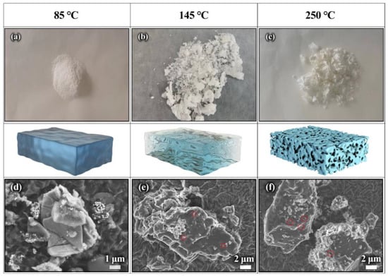 The morphologies were characterized using SEM techniques, as observed in Figure 3d–f. Figure 3d shows that the precursor is composed of large blocks. Additionally, the surface is rough and no pores can be found, implying that there are no gases escaping at 85 °C. As seen in Figure 3e, the surface become relatively smooth and there are a small number of pores that exist, marked in red circles, indicating the presence of gas escape. When the treatment temperature is 250 °C, the surface become smoother (Figure 3f). This is because the decomposition products at 250 °C are mostly liquid phase, the smooth surface can be formed after the natural cooling and solidification. Meanwhile, a large number of pores are present, which is caused by the release of large amounts of CO2 and H2O, etc., gases derived from the decomposition of raw materials. The phenomenon is in agreement with the above FITR, XRD and photograph results, which suggests that the temperature has an effect on the morphology and structure of precursors and may further influence the final products.