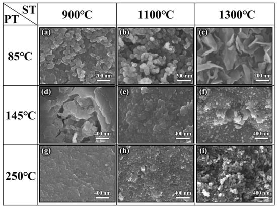 SEM images of h-BN under (a–c) PT—85 °C and ST—900, 1100 and 1300 °C; (d–f) PT—145 °C and ST—900, 1100 and 1300 °C; (g–i) PT—250 °C and ST—900, 1100 and 1300 °C.