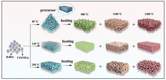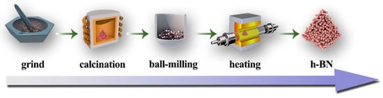 All the chemicals were of analytical grade (A.R.) and without further purification prior to use. The preparation procedure of h-BN nanoparticles includes two steps: (1) the formation of precursor via calcination and ball-milling treatment and (2) conversion of the precursor into h-BN nanoparticles in flowing N2, as illustrated in Figure 10. Firstly, 6 g of H3BO3 and 6.17 g of CO(NH2)2 were ground and mixed to form a homogeneous powder. Then, the powder was filled into a crucible and heated to a certain temperature, i.e., 85, 145 and 250 °C in air in a muffle furnace at the heating rate of 5 °C min−1 to obtain white powder. Subsequently, the powder was milled by conventional wet ball-milling method with ethanol as the medium at 200–300 rpm/min for 4 h to obtain uniform and fine precursor. Then, the obtained precursor was heated in a tube furnace at 900, 1100 and 1300 °C for 3 h in flowing N2. When the furnace was cooled to room temperature, the powder was soaked and rinsed with hot deionized water several times to remove the residual B2O3. Finally, the product was obtained by centrifugation and then drying in an oven.