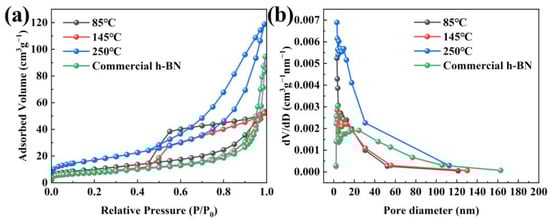 The specific surface area and pore diameter information of samples obtained at 1300 °C are achieved via the N2 adsorption–desorption isotherms, as shown in Figure 9. Figure 9a shows that the sample that came from 250 °C precursors possesses the highest specific surface area of 61.1 m2 g−1, which is caused by the formation of uniform and non-cohesive spherical nanoparticles using 250 °C precursors. In addition, the specific surface area (27.9 m2 g−1) of h-BN at 145 °C treatment temperature is lower than that of 85 °C (36.5 m2 g−1) due to nanoparticles anchored on the bulk matrix to form an entity at 145 °C. However, their specific surface area is higher than the commercial h-BN nanoparticles (26.2 m2 g−1), and their morphology is more uniform and the diameter is smaller, which can manifest in the sintering activity of the synthesized h-BN nanoparticles being correspondingly high [37,38]. Furthermore, the isotherm can be classified as type-IV isotherm with type H4 hysteresis loop at the range of 0.5–1.0 based on the IUPAC nomenclature [39], illustrating that there exist slit-shaped mesopores in the h-BN samples. The pore size distribution is calculated according to the BJH method, as seen in Figure 9b. It is worth noting that the mesoporous distribution of all samples has only a single peak, and most of the pore sizes are distributed between 3 and 12 nm, which indicates that the pore size distribution of all samples is relatively uniform [40,41]. Based on the BJH method, the average pore diameter of 85 °C, 145 °C and 250 °C is determined to be 3.07 nm, 4.29 nm and 3.06 nm, respectively, which is lower than that of the commercial h-BN nanoparticles (23.34 nm). The uniform and finer particles and the high specific area are beneficial to shorten the distance of diffusion and increase the solubility of particles in the liquid phase, which causes an acceleration of the sintering process and will lead to a preferable sintering activity.