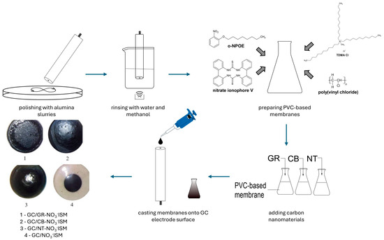 Membranes were casted onto a surface of GC electrodes using a drop casting technique, with the volume of 60 µL. Five items of electrodes representing each group were prepared: sensors with a graphene-modified membrane (GC/GR-NO3−ISM), sensors with a carbon black-modified membrane (GC/CB-NO3−ISM), sensors with a nanotube-modified membrane (GC/NT-NO3−ISM) and sensors with a non-modified membrane (GC/NO3−ISM).
