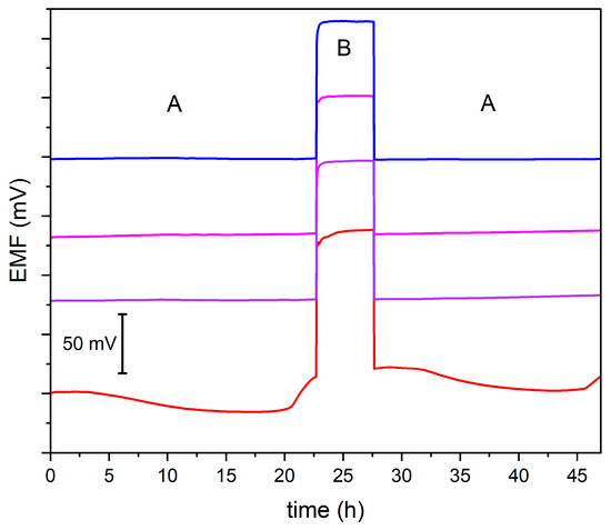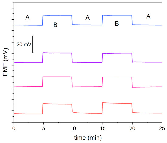 The main goal of this experiment was to evaluate the reversibility of the potential and the stability of the potentiometric response after exchanging the analyzed solutions. For this purpose, using a 10−4.5 M KNO3 solution (A) and a 10−4 M KNO3 solution (B), the potential was measured alternately for 5 min, as presented in Figure 3. Modified electrodes exhibit stable and reversible potential. Slight changes in stability were observed in a non-modified electrode.