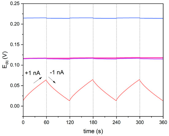 During the measurement, six steps were recorded, which is shown in Figure 6. The carbon nanomaterial-modified electrodes exhibited a lower potential response to the current flow in comparison to non-modified electrodes. The results (electrical capacitance and resistance parameter values) are presented in Table 2, together with the values obtained with the EIS technique.