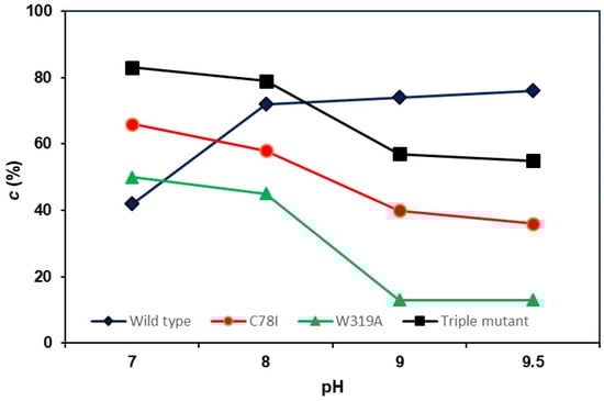 In biocatalyzed processes, the protonation state of the catalytic residues is essential for achieving efficient reactions. Therefore, the effect of pH on the biocatalytic properties of wild-type mFMO and its three mutants was studied. Previous research has shown that pH modification greatly influences the activity of monooxygenases, such as BVMO from Thermobifida fusca (PAMO) []. In this study, no effect of pH (ranging from 7.0 to 9.5) on enzyme selectivity was observed when oxidizing thioanisole (1a) as a model substrate (see Supporting Information, Figure 2). However, different behaviors in enzymatic activity were noted. For wild-type mFMO, an increase in conversion was observed when moving from pH 7.0 to 8.0, with a slightly higher conversion seen at pH 9.5, achieving a 76% conversion of (S)-1b after 24 h. In contrast, the mutants C78I, W319A, and the triple mutant showed the highest conversions at pH 7.0, with a decrease in activity at more basic pHs, especially at values higher than 9.0.
