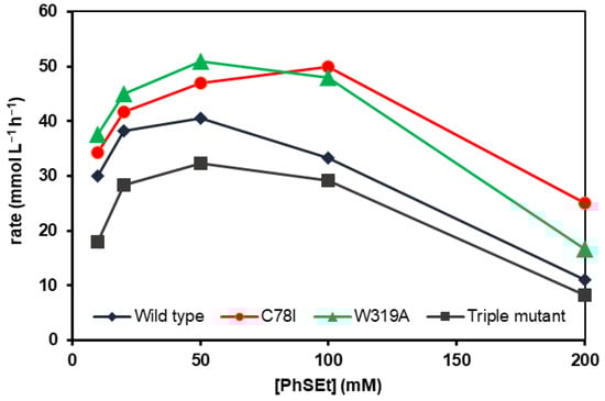 The effects of 2a concentration on the conversion and the enantioselectivity of the enzymatic sulfoxidation catalyzed by the mFMO biocatalysts were also analyzed (Figure 3). To compare the conversions obtained at different times (24–72 h), the reaction rate, expressed as the millimoles of 2a consumed per hour per liter, was defined. Up to concentrations of 50 mM, the best results were achieved with W319A. However, from 100 to 200 mM, C78I showed better performance. Wild-type mFMO, W319A and the triple mutant exhibited similar behavior. The reaction rate increased with rising 2a concentrations, reaching a maximum around 50 mM (40.6 mmol L−1 h−1 for the wild-type enzyme; 51.0 mmol L−1 h−1 for W319A; and 32.3 mmol L−1 h−1 for the triple mutant). Beyond this concentration, the reaction rate decreased. C78I displayed a slightly different trend, with the highest reaction rate observed at 100 mM 2a (50.0 mmol L−1 h−1) and a lower but still good rate at a substrate concentration of 200 mM (25.0 mmol L−1 h−1). For all biocatalysts tested, no changes in selectivity were observed with increasing substrate concentration, as each enzyme achieved similar enantiomeric excesses under all conditions analyzed (Supporting Information).