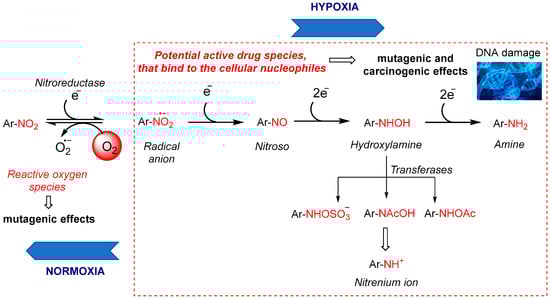 The mechanism by which nitro compounds localize within cells under hypoxic conditions involves multiple stages (Figure 2). In the initial and most crucial step, cellular nitroreductase enzymes reduce the nitro group of the prodrug molecule to a nitro anion radical, a short-lived species, especially in an aqueous medium. Under normal oxygen levels (normoxia), the NO2.− radical is quickly oxidized back to the original NO2 group (re-oxygenated), producing superoxide anions (O2.−) in the process [].