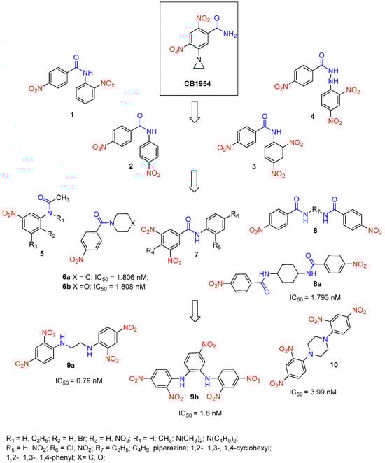Further in this direction, Tokay et al. present the synthesis of N-(substituted)-2,4-dinitroaniline derivatives, in particular symmetrical bis(2,4-dinitrophenyl)diamine derivatives 9 and N-(5-morpholino-2,4-dinitro phenyl)alkanamides 10. These aromatic secondary amines were derived from 2,4-dinitro-1-chlorobenzene and various aliphatic, alicyclic, aromatic, or heterocyclic diamino derivatives utilizing Et3N or NaH as a base in DMF solvent at room temperature or 60–70 °C via the SNAr reaction mechanism []. The design of these compounds was based on model bioreductive dinitroaniline prodrugs such as CB1954, SN23862, and PR-104A. The cytotoxic effects of prodrug candidates were assessed using the MTT assay on human hepatoma cells (Hep3B), prostate cancer cells (PC-3), and human umbilical vein endothelial cells (HUVEC) as healthy controls. The compounds with minimal toxicity were further investigated to evaluate their potential as prodrug candidates. Biochemical analyses were conducted to examine the reduction profiles and kinetics of prodrug–Ssap-NtrB combinations. Subsequently, selected prodrug–Ssap-NtrB combinations were applied to prostate cancer cells to assess their toxicity. The combined results from theoretical, in vitro cytotoxic, and biochemical studies indicate that prodrug/enzyme combinations such as 9a—Ssap-NtrB, 9b—Ssap-NtrB, and 10—Ssap-NtrB hold promise as potential candidates for nitroreductase (Ntr)-based prostate cancer therapy.