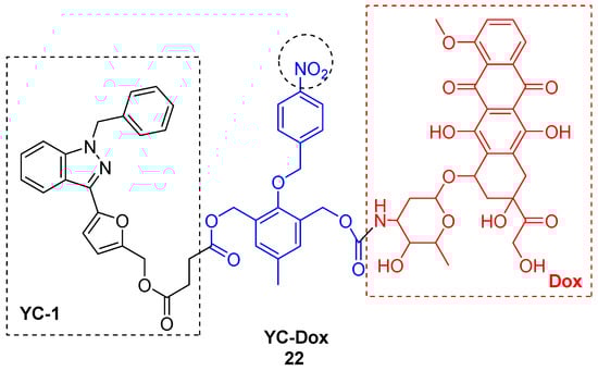 Nitrobenzyl trigger was used in the construction of hypoxia-activated prodrug YC-Dox 22 (Figure 8) []. This prodrug is capable of specifically releasing the chemotherapeutic agent Dox and the HIF-1α (hypoxia-inducible factor-1α) inhibitor YC-1 hemisuccinate (3-(5′-hydroxymethyl-2′-furyl)-1-benzylindazole) in response to hypoxia.