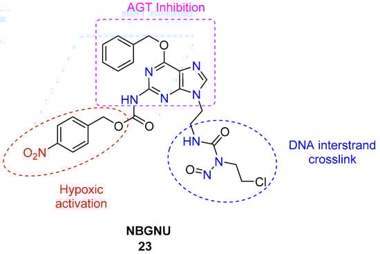 Ce, Y et al. reported the synthesis of the hypoxia-activated prodrug, N-(2-chloroethyl)-N-2-(2-(4-nitrobenzylcarbamate)-O6-benzyl-9-guanine)ethyl-N-nitrosourea (NBGNU), 23 (Figure 9) []. The molecule integrates the chloroethylnitrosourea (CENU) pharmacophore to induce DNA interstrand cross-links and an O6-benzylguanine analog moiety (angiotensinogen (AGT) inhibitor) masked by a 4-nitrobenzylcarbamate group to induce hypoxia-activated inhibition of O6-alkylguanine-DNA alkyltransferase. Its anticancer effectiveness was assessed through in vitro experiments. The prodrug demonstrated promising antitumor efficacy and hypoxic selectivity due to the incorporation of an AGT inhibitor and hypoxia-activated pharmacophores into the side chain of the CENU moiety. The activity of 23 against AGT-expressing human glioma SF763 cells under hypoxic conditions (IC50 = 126 μM) was significantly higher than under normoxic conditions (IC50 = 580 μM). This indicates that NBGNU selectively undergoes reduction under hypoxic conditions, leading to the unmasking of the 2-amino group of guanine, the release of O6-BG analogs, and the effective inhibition of AGT. However, to further enhance its hypoxic selectivity and chemotherapeutic efficacy, improvements are needed to reduce normoxia activation and increase water solubility.