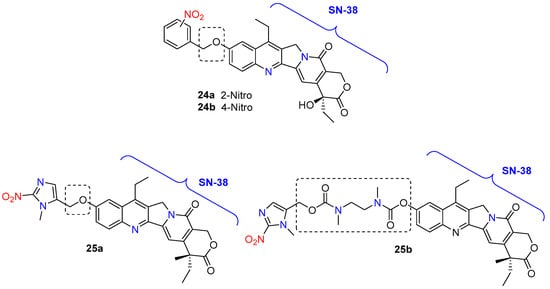 Choi and co-workers [] conjugate the camptothecin derivate SN-38 with 1-methyl-2-nitro-1H-imidazole-5-yl fragment using two different linkers—an ether linkage 25a and carbamate functionality 25b (Figure 10). The ether analog 25a had moderate hypoxia selectivity and more toxicity compared with TH-302. The different linkers in the structures of the two derivatives likely account for the significant differences in their hypoxia selectivity and toxicity. Compound 25a demonstrated ten times higher toxicity against the human lung cancer cell line H460 and the human colon cancer cell line HT29 compared to the control hypoxia-activated nitroimidazole prodrug TH-302. Furthermore, 25a exhibited lower toxicity than SN-38 under normoxic conditions. However, both the hypoxic selectivity and toxicity of 25a were lower compared to those of compound 25b. Despite this, the ether-linked compound 3a is considered a promising hypoxia-selective antitumor agent.