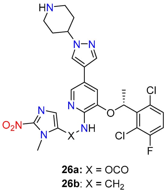 Bielec, B. and colleagues [] developed the first crizotinib prodrugs 26a,b (Figure 11) aimed at reducing severe adverse effects and enhancing anticancer activity. The design of these prodrugs involves a hypoxia-activatable, self-immolative 2- nitroimidazole trigger moiety at a key tyrosine kinase binding site of crizotinib, which significantly reduces its affinity for the catalytic pockets of the target kinases c-MET and ALK. Two different prodrug derivatives were synthesized: one with the trigger moiety coupled via carbamoylation (26a) and the other via alkylation (26b) of the 2-aminopyridine moiety of crizotinib. Prodrug 26a demonstrated high stability in serum, a crucial requirement for successful prodrug development, and effectively inhibited c-MET phosphorylation and cell proliferation in tumor tissues in vivo following intravenous application. Overall, the data suggest that prodrug 26a is a promising candidate for further (pre)clinical development as a novel tyrosine kinase inhibitor with improved tumor-specific properties.