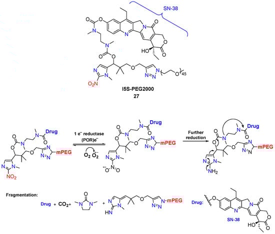 In another study, a hypoxia-activated camptothecin derivative embodies a multifunctional bioreductive linker based on 1-methyl-2-nitroimidazole. The incorporation of a PEG chain in the linker increased the water solubility of the SN-38- prodrug 27 and ensured stability under physiological conditions []. When conjugated with SN-38, this linker demonstrated the capability to efficiently release the drug through a two-step process: reductive activation of the 2-nitroimidazole, followed by spontaneous degradation of the linker via 1,6-elimination and cyclization-elimination, ultimately resulting in drug molecule release (Figure 12).