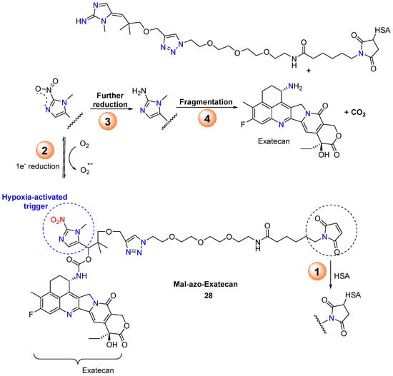 Encouraged by the great properties of the multifunctional linger-containing 1-methyl-2-nitroimidazole trigger unit [], Chang et al. reported the synthesis and biological evaluation of the hypoxia-activated albumin-binding prodrug Mal-azo-Exatecan 28 (Figure 13) []. The 5-position branched linker of 1-methyl-2-nitro-5-hydroxymethylimidazole served as a hypoxic cleavage trigger, linking the camptothecin analog Exatecan via a carbamate bond. After intravenous administration, the side-chain maleimide rapidly binds to human serum albumin (HSA). The HSA-azo-Exatecan carrier system accumulates in tumor tissue through the enhanced permeability and retention effect, as well as the interaction with the albumin receptor gp60. In the hypoxic tumor environment, Exatecan is released, triggered by nitroreductase. The nitroimidazole trigger has high plasma stability and does not cause the chemotherapeutic agent release from HSA-azo-Exatecan during circulation in vivo, avoiding systemic side drug effects.