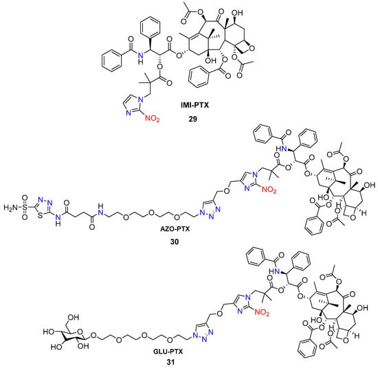 Zhang and co-workers [] reported the synthesis of hypoxia-activated paclitaxel (PTX) prodrugs IMI-PXT 29 based on hypoxia-sensitive 2-nitroimidazole moiety. The 2-nitroimidazole unit at the N-1 position is connected to 2′-OH of PTX via an ester bond with pivalic acid for easier drug release. The GLU-PTX 30 and AZO-PTX 31 prodrugs (Figure 14) contain glucose and acetazolamide as targeting ligands.