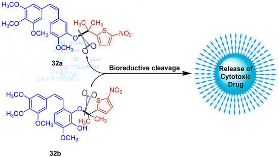 Winn et al. reported the synthesis of the scombretastatin A-1 (CA1) and combretastatin A-4 (CA4) prodrug conjugates 32a,b (Figure 15) []. The most active compounds in the series were the gem-dimethyl prodrugs of CA1 (32a) and CA4 (32b), exhibiting hypoxia cytotoxicity ratios of 12.5 and 41.5, respectively. This high selectivity is attributed to the gem-dimethyl CA4-BAPC’s enhanced resistance to cleavage in oxygenated environments, allowing the parent anticancer agent (CA4) to be released selectively under hypoxic conditions.