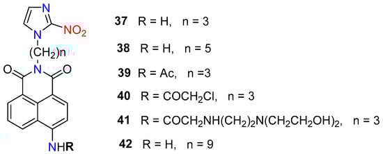 Later, Hodgkiss et al. obtained a family of hypoxia-activated fluorescent naphthalimides (37–42) containing 2-nitroimidazole side chains (Figure 18). These molecules were nonfluorescent due to the photoinduced electron transfer (from the fluorophore-excited state to the nitroaromatic moiety), which was prevented after enzymatic bioreduction []. Furthermore, it is well known that the bioreduction of nitroimidazoles leads to intracellular bioreductive metabolites that react with biomolecules, thus providing a binding mechanism for the fluorescent probes to hypoxic cells. Since this report, the 2-nitroimidazole side chains have become a major tracer for hypoxic cells and remain popular to date.