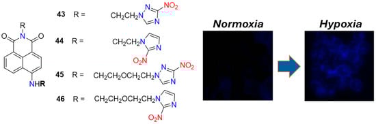 Due to the relatively easy synthesis and well-predicted off-on fluorescent response to intracellular oxygen concentration, numerous nitroaromatic structures have been developed for hypoxia imaging based on the two principles mentioned above: the bioreduction of a nitro group directly attached to the fluorophoric system, or the use of 2-nitroimidazole side chains. For example, Qian et al. extended the concept of Hodgkiss et al. by preparing similar naphthalimides (43–46, Figure 19) but with two 2-nitroimidazole fragments instead of one, thus reporting the first hypoxic probes containing two heterocyclic-binding side chains []. The main motive for the synthesis of compounds 44 and 46 was the study of the side chain effect in C4-position of the naphthalimide ring, which plays a more important role than the fluorophoric architecture itself during interaction with DNA and probe interference. The authors discovered that in V79 cells, probe 46 exhibited a higher fluorescence enhancement (FE = 20 times) compared to 44 (FE = 15 times). This difference in signal responses between the two probes was attributed to the shorter side-chain length of 44 compared to 46, which reduces the possibility of fluorescent quenching due to intramolecular photoinduced electron transfer from the reduction products of the nitroimidazole moiety to the excited naphthalimide fluorophore.