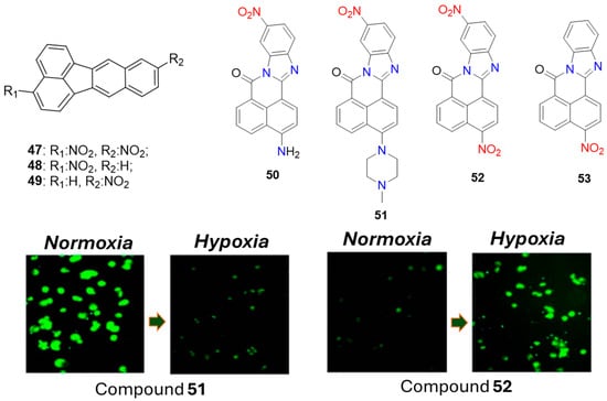 Chemical structures of hypoxia-activated 1,8-naphthalimide probes 47–53 and V79 cells incubated with 51 (left) and 52 (right) under normoxic and hypoxic conditions. Adapted with permission from []. Copyright (2008) Springer Nature.