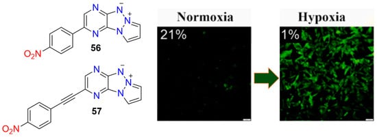 Janczy-Cempa et al. employed a similar strategy in the design of two nitro-pyrazinotriazapentalene derivatives, 56 and 57 (Figure 22), initially exhibiting weak fluorescence []. Upon reduction of their nitro groups by NTR, a significant fluorescence enhancement with a 15-fold increase in intensity was observed. The reduction process with NTR was selective, with linear ranges of 0–4 μg/mL and limits of detection of 18.6 ng/mL for 56 and 33.2 ng/mL for 57, respectively. Both probes were non-toxic and successfully employed for imaging hypoxia in the A2058 cell line.