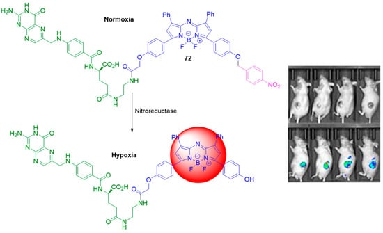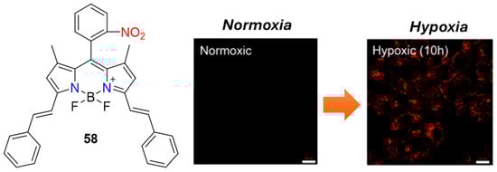 The current focus on developing highly emissive fluorescent probes in the near-infrared (NIR) region is driven by NIR’s superior penetration ability in living systems, effectively minimizing interfering bio-autofluorescence. This motivation led Fan et al. to synthesize a BODIPY-based fluorescent probe, 58, for hypoxia imaging (Figure 23) []. Initially non-emissive, compound 58 contained a fluorescent-quenching nitro group that could be selectively reduced by NTR to its amine form. Upon reduction, the resulting amino derivative exhibited bright fluorescence in the NIR spectrum at 713 nm. Unlike its precursor, the fluorescence of the amino derivative of 58 showed a linear increase, correlated with the NTR concentration in the range of 0.1−1.0 μg/mL. A significant 55-fold maximum fluorescence enhancement was achieved, with a calculated limit of detection (LOD) of 7.08 ng/mL. Building upon probe 58, nanoparticles were developed and used as fluorescent probes for hypoxia imaging both in vitro (H9c2 cells) and in vivo (ischemic mice model). These nano-probes demonstrated negligible toxic effects, making them suitable for in vivo applications.