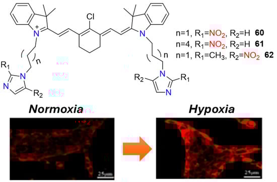 Probe 59 (Figure 24) represents another notable example of a NIR fluorescent probe designed for hypoxia imaging, featuring a directly attached nitro group as a recognition unit for NTR []. Upon selective reduction by NTR, probe 59 exhibited remarkable fluorescence, peaking at 740 nm. This resulted in a 32-fold enhancement in fluorescence intensity and an exceptionally low detection limit of 1.09 ng/mL. Probe 59 was effectively utilized for visualizing hypoxic cancer cells (HeLa, HepG2) and hypoxic tumors in a tumor-bearing mouse model. Furthermore, MTT analysis indicated negligible cytotoxicity, underscoring its potential as a highly valuable tool for both in vitro and in vivo monitoring of hypoxia status.