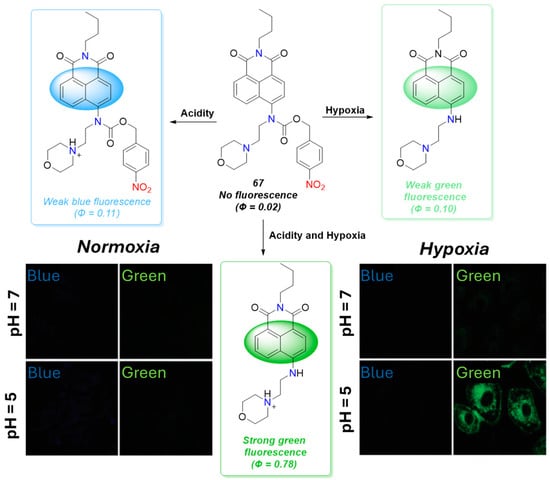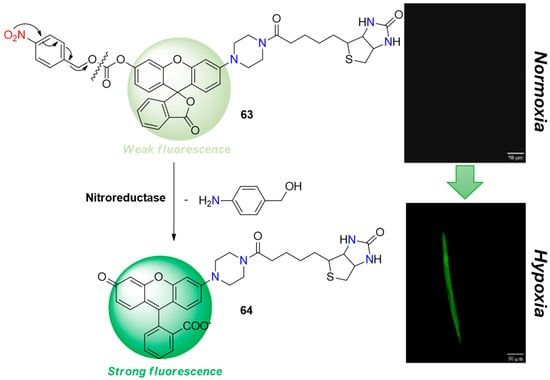 To date, the nitro aromatic compounds were used as a platform for fluorescent recognition of hypoxia according to two major mechanisms, and both were based on the bioreduction of the nitro aromatic system. The first one referred to the selective labeling of hypoxic cells due to the reduction of a nitroaromatic moiety in the fluorophore architecture to amine. The main concept here lies in the fact that the nitro group is well known as a fluorescence quencher in aromatic systems, but after the bioreduction of this nitro group in hypoxic conditions, the aromatic systems become fluorescent. The second mechanism was based on the reduction of a fluorescent probe containing 4-nitrobenzyl formiatic, 4-nitrobenzylic, or similar heterocyclic fragments in hypoxic cells, which resulted in a scavenge reaction and alterations in former fluorescence wavelength or intensity (Figure 16).