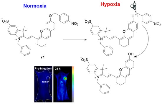 - Karan, S.; Cho, M.; Lee, H.; Park, H.; Sundararajan, M.; Sessler, J.; Hong, K. Near-Infrared Fluorescent Probe Activated by Nitroreductase for In Vitro and In Vivo Hypoxic Tumor Detection. J. Med. Chem. 2021, 64, 2971–2981. [Google Scholar] [CrossRef]