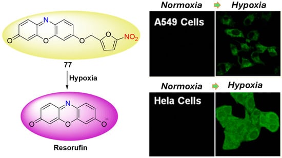 Chemical structures of hypoxia-activated probe 54 and HeLa cells incubated with 54 under normoxic and hypoxic conditions. Reproduced with permission from []. Copyright (2020) The Royal Society of Chemistry.