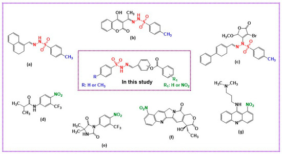 Nitro compounds, which are important intermediates in synthetic organic chemistry, are among the classes of compounds that have important biological and pharmacological effects. To date, a significant number of these compounds have shown various biological activities, including anticancer activity, and some of these compounds are still used as drugs in the treatment of many diseases, including cancer [35,36,37,38,39,40,41]. Examples of drugs containing nitro groups used in cancer treatment include flutamide (d) and nilutamide (e) (Figure 1). These drugs, which carry a nitro group in the benzene ring, are widely used for the treatment of prostate cancer [36,39]. Rubitecan (f) and nitracrine (g) are anticancer drugs that contain nitro groups (Figure 1). Rubitecan is a derivative of camptothecin. Nitracrine is an acridine derivative. These drugs are used to treat various cancers [36]. Inspired by the information given above, to discover new and potent anticancer drug candidates, we aimed to synthesize new anticancer drug candidate compounds bearing sulfonyl hydrazone and nitroaromatic moieties as pharmacophores and to evaluate their cytotoxic potential against A549 and MCF-7 cancer cell lines. Herein, the newly synthesized compounds were characterized spectroscopically using spectroscopic techniques (1H NMR, 13C NMR, and FT-IR) and elemental analysis. Our drug design strategy for the molecules targeted in this study was based on investigating the effects of methyl and nitro groups in the molecular skeleton on the antiproliferative activities of newly synthesized hybrid molecules against these cancer cell lines, as shown in Figure 1.
