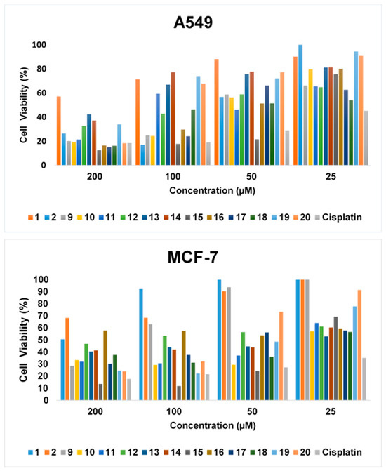Currently, chemotherapy is the most commonly used approach for the treatment of cancer. Available drugs have many side effects, such as low selectivity, toxicity, and acquired drug resistance [42,43]. Therefore, there is an urgent need to develop new and potent anticancer agents. Lung and breast cancers, which have different biological characteristics and treatment approaches, are among the most common cancer types worldwide and cause the most deaths [44]. Therefore, in this study, the in vitro cytotoxic activities of all the synthesized compounds (1, 2, and 9–20) were investigated against A549 and MCF-7 cell lines. The cells were treated with different concentrations of the molecules (200, 100, 50, and 25 µM) for 72 h and the IC50 values were determined. The results are presented in Table 1.