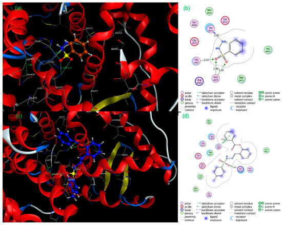 Hydrazones are a remarkable class of biologically active compounds that have attracted the attention of medicinal chemists owing to their many pharmacological properties. In recent years, many researchers have been designing and synthesizing these molecules to obtain drugs with the least toxicity and the greatest possible therapeutic effect for use in the treatment of some important diseases [10]. In the literature, researchers have reported in some studies that compounds carrying the hydrazide–hydrazone moiety have different pharmacological activities [11,12,13]. Among these, iproniazid and isocarboxazid are commercial products obtained by reducing this chemical group. In addition, nifuroxazid is an example of a commercial product that also carries this pharmacophore group [14]. Iproniazid is used in the treatment of tuberculosis [15]. Its antidepressant effects have also been proven. Nifuroxazide is another hydrazide–hydrazone with proven therapeutic efficacy when used as an intestinal antiseptic [16,17]. Regarding these compounds, it has been reported that the protons (-NHN=CH-) in the azomethine part of their structure cause therapeutic effects [18]. On the other hand, sulfonyl hydrazones have attracted great attention in recent years due to their numerous potential uses in medicinal chemistry [19]. The pharmacological properties of these compounds, such as enzymatic modulation [20], analgesia [21], antifungal aspects [22], and antibacterial potential [23,24], are essentially well known. In addition, these compounds have a wide range of bioactivities, including anticancer [25,26,27,28,29,30], antidepressant [31,32], and anticholinesterase activities against Alzheimer’s disease [33,34]. Among the sulfonyl hydrazone derivatives with anticancer activity, 4-methylbenzene sulfonyl hydrazone derivatives (compounds a [25], b [28], and c [27] (Figure 1) were determined to show varying ranges of cytotoxic activity against various cancer cell lines.