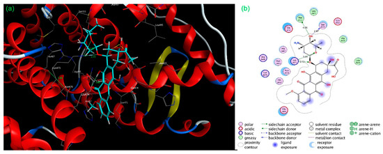Three-dimensional (a) and two-dimensional (b) interaction diagram for the standard, doxorubicin inside the binding pocket of target 1x7b.
