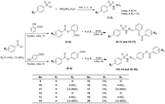 General synthesis pathway for new sulfonyl hydrazones (9–20).