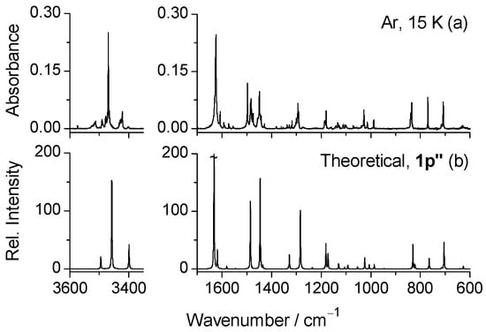 (a) Experimental IR spectrum of 5-(4-aminophenyl)-tetrazole 1p in an Ar matrix at 15 K; (b) B3LYP/6-311++G(d,p) theoretical IR spectrum of 1p″.