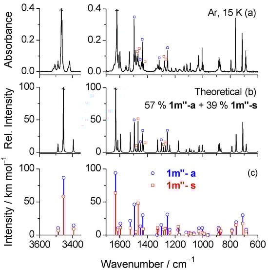 Figure 1a and Figure 2a depict the experimental IR spectra of 1p and 1m, respectively, isolated in an Ar matrix at 15 K, accompanied by the theoretical IR spectra of 1p″ and 1m″, shown in Figure 1b and Figure 2b. For 1m″, the theoretical spectrum was derived by co-adding the B3LYP spectra calculated for the two predicted conformers (Figure 2c) with the intensities multiplied by their estimated gas-phase Boltzmann populations. Overall, there is a good correspondence between the experimental spectra of matrix-isolated 1p and 1m and the theoretical spectra computed for 1p″ and 1m″, respectively. On the contrary, the experimental spectra are not well reproduced by the spectra computed for 1p′ or 1m′ (Figures S2 and S3). This is consistent with the theoretical predictions and demonstrates that there is an overwhelming predominance of the 2H tautomeric forms in the as-deposited Ar matrices.