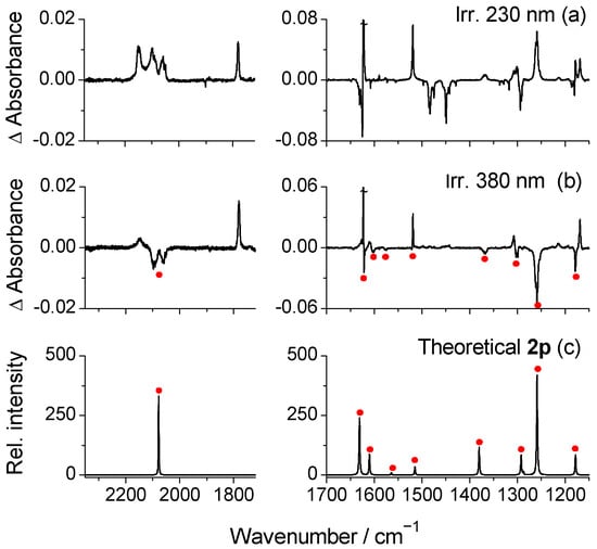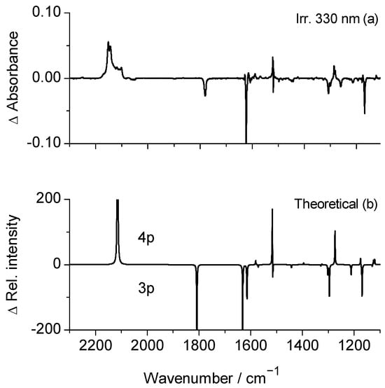 Concomitantly with the decrease in the bands assigned to 2p, other bands that emerged upon the excitations at λ = 230 nm, including those at 2150 cm−1 and 1781 cm−1, are intensified during the irradiations at λ = 380 nm (see Figure 3b). This observation demonstrates that the corresponding photoproducts are generated with the intermediacy of 2p. Building upon existing knowledge of the photochemistry of nitrilimines, these photoproducts are most likely 4-aminophenyl-1H-diazirine 3p and 4-aminophenyl-carbodiimide 4p [3,17,18,19,34,35]. Both species could be easily identified through the outcomes of additional irradiations carried out at λ = 330 nm (after the consumption of 2p). The comparison of the difference spectrum resulting from these irradiations (Figure 4a) with the calculated difference spectrum 4p–3p (Figure 4b) demonstrates clearly that the negative bands are assigned to 3p while the positive ones are assigned to 4p, i.e., 3p photorearranges to 4p [16,20]. The main absorption of 3p is that identified at 1781 cm−1 (predicted at 1808 cm−1), which is particularly characteristic of 1H-azirines [17,18,20,36] and is assigned to the three-membered ring ν(C=N) vibration. Regarding 4p, its most prominent band is identified at 2150 cm−1 (predicted at 2115 cm−1), which is particularly characteristic of carbodiimides and is assigned to the νas(NCN) vibration [16,17,18]. In summary, our results reveal that once 2p is generated from 1p by N2 elimination, it photoisomerizes to yield 4p via 3p (see Scheme 3). This reasoning agrees with the mechanism of reactivity that has been established in previous photochemical studies carried out for similar systems [17,18].