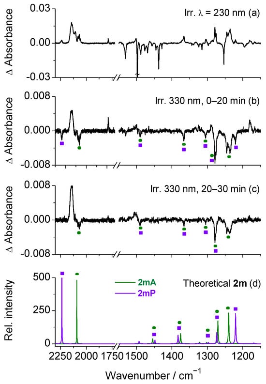 Experimental difference IR spectra (2300−1100 cm−1) showing changes (a) after irradiation of matrix-isolated 1m (Ar, 15 K) at λ = 230 nm and (b,c) after subsequent irradiations at λ = 330 nm (the negative bands labeled by green circles and violet squares are due to the consumed photoproducts assigned to 2mA and 2mP, respectively); (d) theoretical IR spectra of most stable conformers of 2mA (green) and 2mP (violet) calculated at the B3LYP/6-311++G(d,p) level (see Table S3 for details).