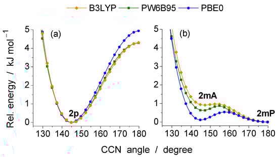Relaxed potential energy scan as function of the CCN angle for (a) C-(4-aminophenyl)-nitrilimine 2p and (b) C-(3-aminophenyl)-nitrilimine 2m. The scans were computed using the B3LYP (blue), PW6B95 (green), and PBE0 (orange) DFT functionals with the 6-311++G(d,p) basis set. Along the scans, the value of the CCN angle was incrementally fixed in steps of 2.5 degrees, and all other geometrical parameters were fully optimized.