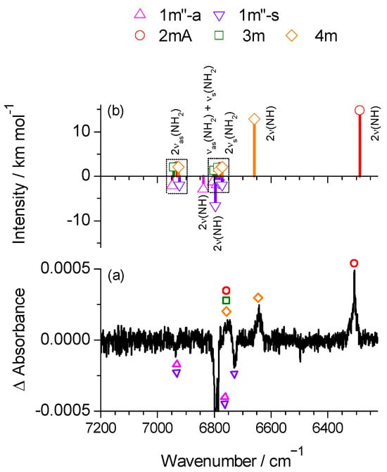 (a) Selected region of a difference near-IR spectrum (7200–6050 cm−1) showing changes after 20 min UV irradiation of 1m″ at λ = 230 nm, followed by subsequent 20 min of irradiation at λ = 330 nm. Positive bands are assigned to 2mA, 3m, and 4m species (2mP was not identified as it was consumed during the first 20 min of irradiation at λ = 330 nm, Figure 5), while the negative ones are assigned to 1m″-a and 1m″-s. (b) B3LYP/6-311++G(d,p) anharmonic wavenumbers and IR intensities (both unscaled) calculated for the first overtones of the NH stretching vibration [2ν(NH)], first overtones of the antisymmetric [2νas(NH2)] and symmetric [2νs(NH2)] stretching vibrations, and νas(NH2) + νs(NH2) combination modes (see Table S6 for details).