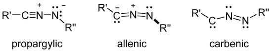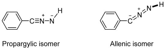In general, nitrilimines are monoisomeric species and, depending on the R′ and R″ substituents, exhibit predominantly propargylic or allenic structures [3,16]. However, some nitrilimines with amino (R′ = NH2, R″ = H, or NH2), hydroxy (R′ = H or OH, R″ = OH), and fluoro (R′ = F, R″ = H, or F) substitutions have been shown to possess a significant carbenic character [19,21,22] (Scheme 1). Experimental identification of nitrilimines with distinct structural characteristics can be accomplished by analyzing the infrared frequency of the antisymmetric CNN stretching vibration [3,16,19,21]. Frequencies in the 2300–2150 cm−1 range indicate nitrilimines predominantly propargylic, possessing a CN triple bond, while frequencies below the 2150–2000 cm−1 range denote allenic-type nitrilimines with a cumulenic CNN moiety. Nitrilimines characterized by weak absorption peaks below 2000 cm−1 have a strong carbenic character.